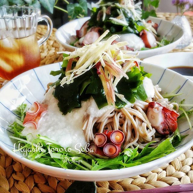 そばは炭水化物の中でもGI値が低い食材です。低カロリーなので夜食におすすめですよ。タコやとろろ、わかめや薬味などを使用して簡単に作っています。