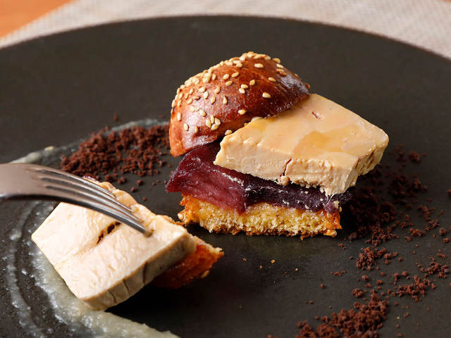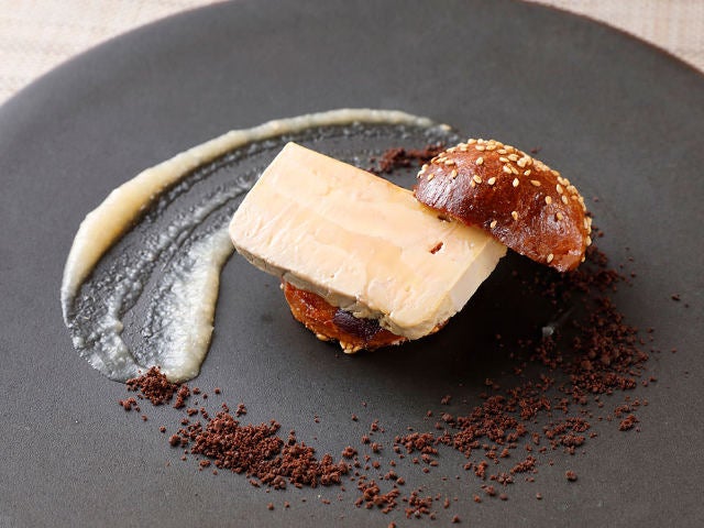 フォアグラのテリーヌは濃厚でまったりとした味わい。舌の温度でゆっくりと溶けていくさまは、まるで上等なバターを口に含んでいるかのよう…。しばし余韻に浸っていたくなるおいしさだ。