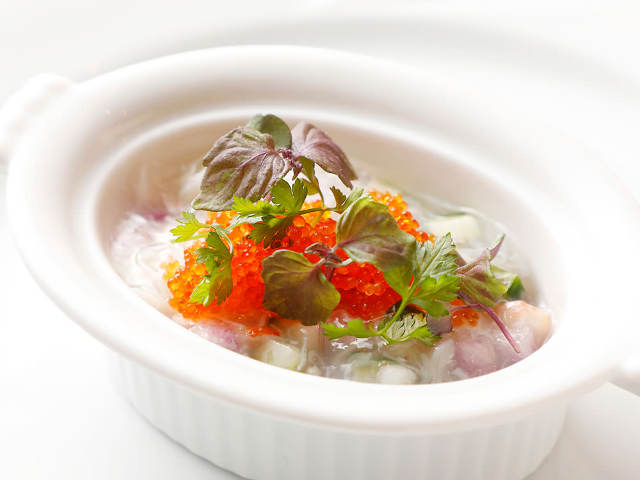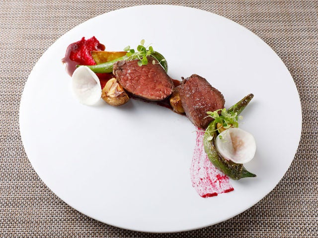 見た目にも美しい冷製茶碗蒸しは、オマール海老のダシがたっぷり効いたアメリケーヌソース、コクとうまみの強いブランド卵「恵壽卵(けいじゅらん)」、生クリームなどで作られる。まるでプリンのような、なめらか食感が心地よい。
