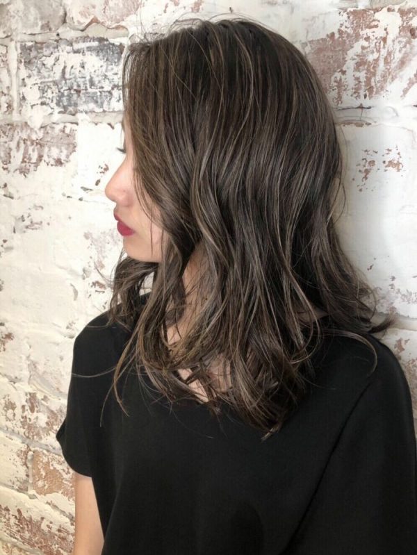 暗めのアッシュグレージュにさりげなくハイライトを混ぜることで、落ち着いた印象のヘアカラーに大変身。