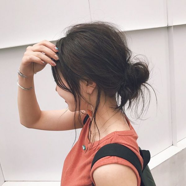 おだんごから自然に飛び出た毛が、程よいルーズさを演出してくれる便利な髪型です。