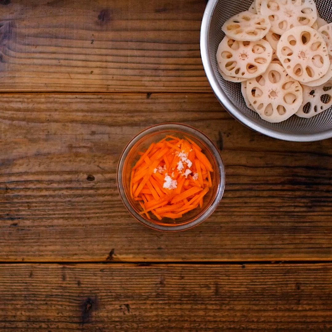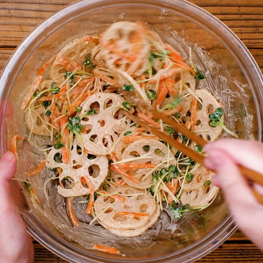 ボウルに (a) の調味料を加えて混ぜ合わせ、れんこん、水気を切ったにんじん、かいわれ大根を加えて混ぜ合わせます。