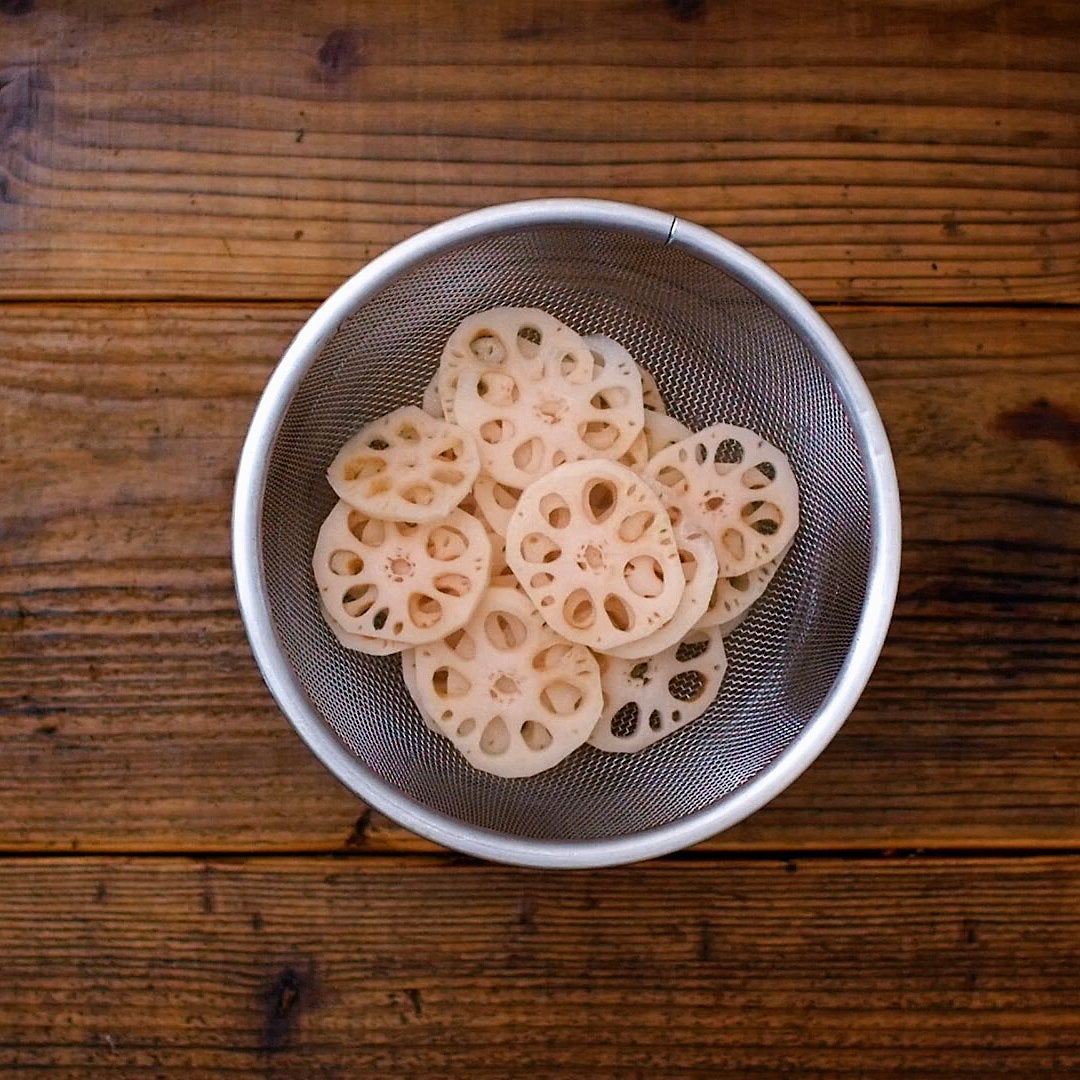 鍋に熱湯を沸かし、酢を加えます。れんこんを入れてさっとゆでてザルに取り出して粗熱を取ります。