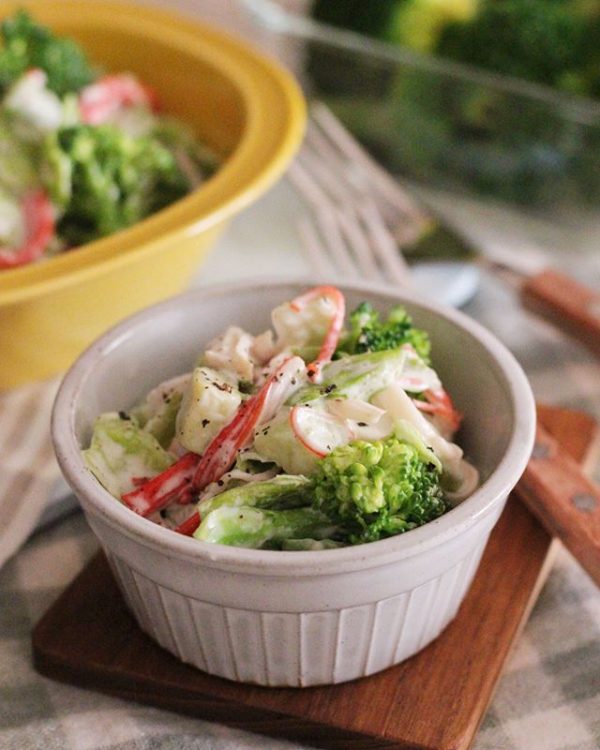 ワンタンスープにはコクのあるマヨネーズベースのサラダも良く合います。こちらはブロッコリーと蒸し鶏で作るデリ風のおしゃれなレシピ。