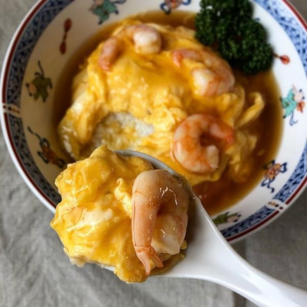 こちらはエビを使ったアレンジ天津飯で、甘酢あんがご飯と卵に絡んで美味しいですよ。
