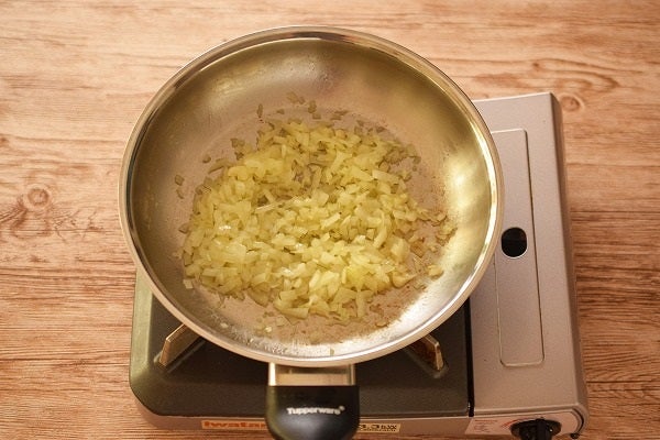 1、フライパンに小さじ1のオリーブ油と玉ネギを入れ、中火で炒める。分量外の塩をふり、しんなりするまで炒めたら火をとめ、バットにあけ、冷ます。