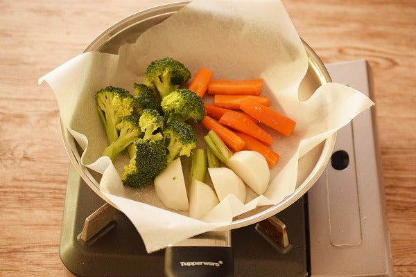 2、<付け合わせ>を作る。フライパンに分量外の水1/2カップを注ぐ。上から、オーブンシートをしき、ブロッコリー、カブ、ニンジンをのせる。分量外の塩少々をふったら蓋をし、強火にかける。沸騰してきたら、中火にして、柔らかくなるまで蒸す。蒸し上がった野菜から取り出す。