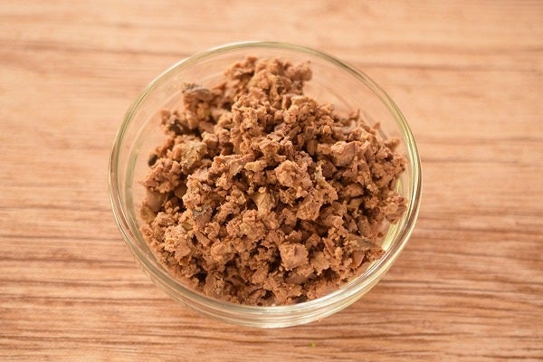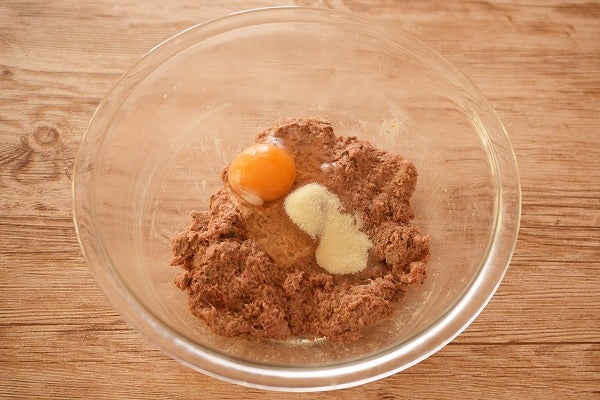 3、ボウルに合いびき肉、レバー、<調味料>を入れ、全体が馴染むようにしっかりと混ぜる。