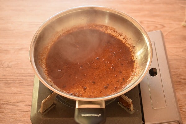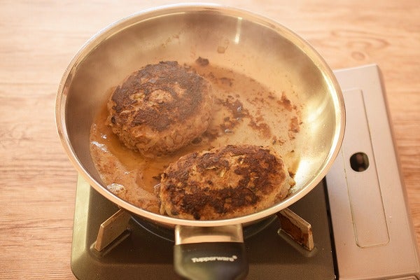 6、ハンバーグを取り出し、フライパンの余分な油は取り除く。<ソース>の材料をフライパンに入れ、フライパンの底をこそげながら、ひと煮立ちさせる。