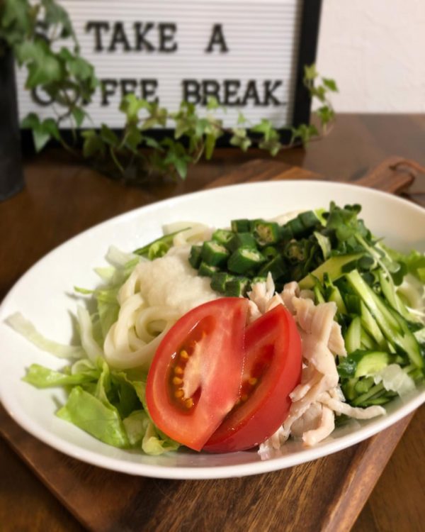 不足しがちなレタスやトマトなどの生野菜、それに長芋やオクラもうどんに合います。