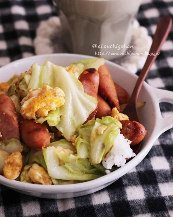 余ることの多い野菜や食材で簡単に作れるレシピがこちらのキャベ玉丼。用意する食材はキャベツ、卵、ウインナー、そしてご飯だけです。