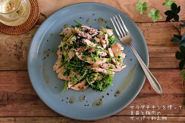 材料が揃えやすく手軽に作れるので、一人暮らしにおすすめのおかずがこちらの豆苗とサラダチキンの和え物。