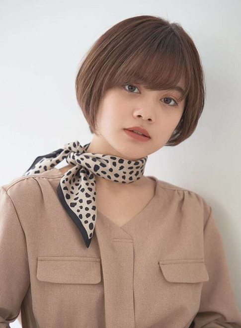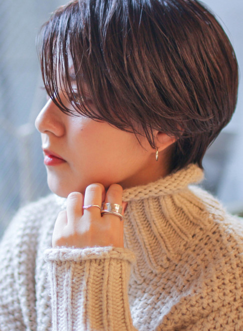 乾かすだけで決まる、イージーケケアが嬉しいショートスタイルです。ふんわり丸みのあるシルエットにカットし、前髪は長めに作って印象的な目元を演出。耳にかけたり下ろしたりで、印象チェンジも自由自在。