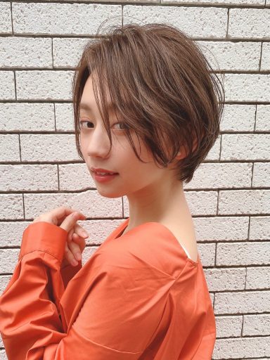 レイヤーを入れて前髪をサイドの髪とナチュラルに馴染ませつつ、襟足を短めに揃えるのがポイントです。コンパクトなシルエットながら、しっかり顔周りをカバーできるので、エフォートレスなフェミニンさを醸せます。