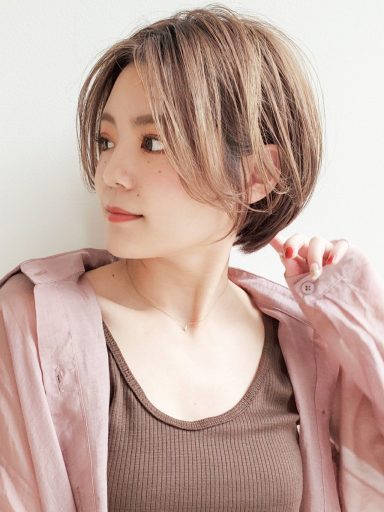 コンパクトにまとまるひし形シルエットのショートボブは丸顔さんに馴染みやすく、美バランスかつ小顔効果の高さが魅力です。
