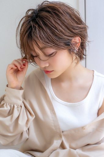 ひし形を意識してつくったショートボブはふんわりエアリーに仕上げるのがポイント。レイヤーとカールでフェイスラインに髪を沿わせつつ毛先を外ハネにすることで、より小顔効果がUPします。また、ウェットな質感のスタイリング剤を使用して、抜け感をグッと高めるのもおすすめです。