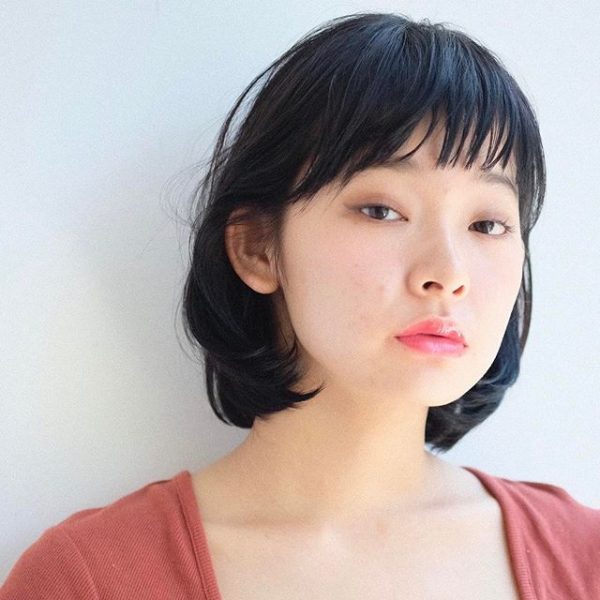 黒髪のナチュラルなスタイルですが、内巻きの毛先とマニッシュな短め前髪が洗練された印象にしてくれます。