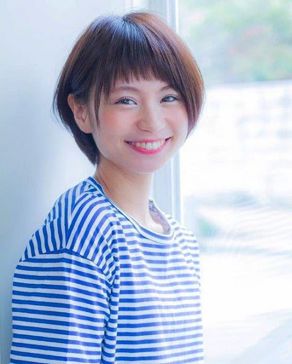 襟足短めで前髪は重めの、40代にぴったりのショートボブ。暗く見られがちな方は、前髪なしにするだけで楽して垢抜けます。