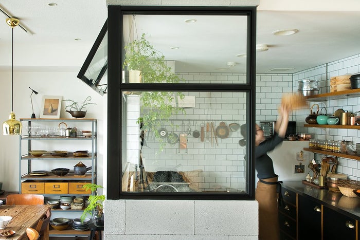 でも、完全にクローズドな空間にしてしまうと、光も入らないしやっぱりちょっとさみしいじゃないですか(笑)。この物件はリノベーションする前は開口部分が大きい一般的なキッチンカウンターだったので、そこに窓を取り付けてもらいました」 リノベーションでは間取りは大きく変えず、既存をうまく再利用。キッチンもビルトインオーブンとコンロは新たに入れ替えたそうですが、じつは天板やシンク、収納などは元から備わっていたものを使っているのだとか。
