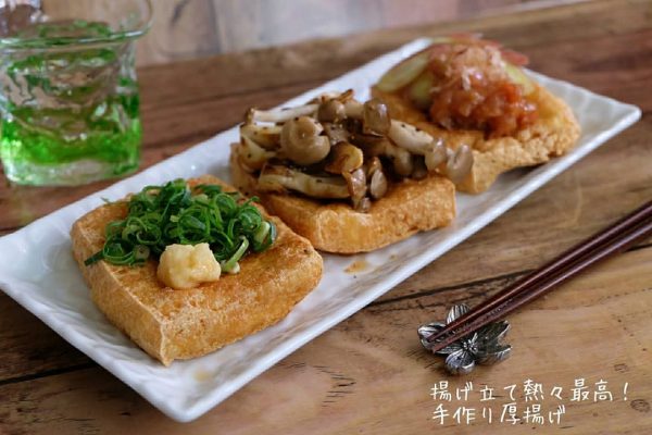手作りの厚揚げにお好みの薬味をトッピングした副菜おかずは、酒の肴に人気の付け合わせレシピですね。