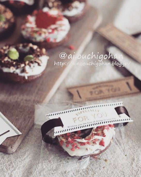 焼きドーナツにチョコレートをかけて、様々な模様にデコレーションした人気のスイーツです。ラッピングにはマチなしの袋を使用してマスキングテープで止めています。