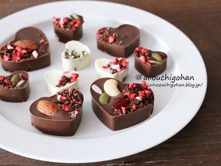 湯煎で溶かしたチョコを型に入れてから、ナッツやドライフルーツなどでデコレーションしたレシピです。