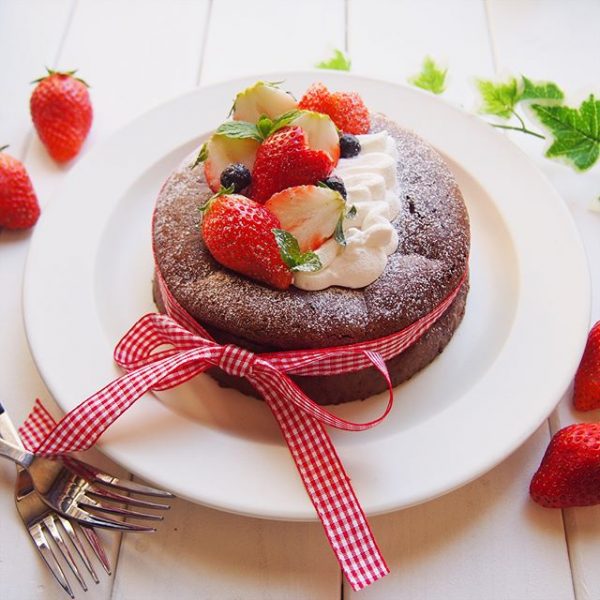バレンタインらしくチェックのリボンを結んでプレゼント風に仕上げています。デコレーションはイチゴとクリームをふんだんに使っておしゃれに仕上げましょう。