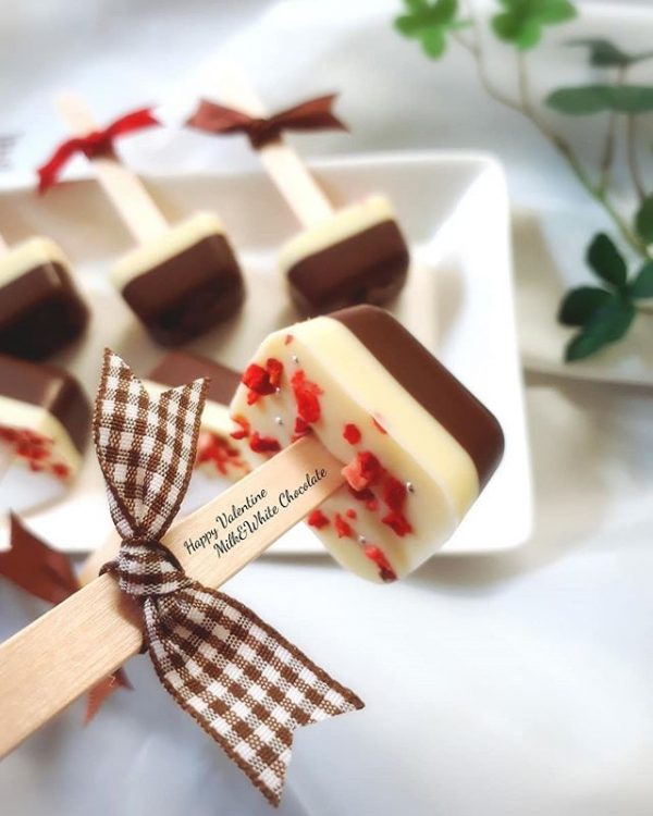 バレンタイン用にリボンを竹棒に巻きつけて可愛くしてくださいね。これなら義理チョコバレンタインにも使える一品です。