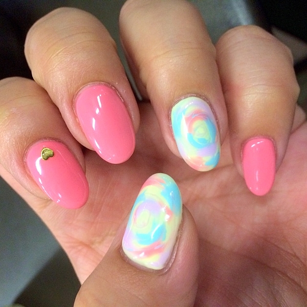 ぐるぐるっと大胆にまわしこんだデザインのマーブル。2本だけですが、ほかの爪にビビットカラーを入れ込んであげればそこまで手間がかからずおしゃれなネイルの完成です