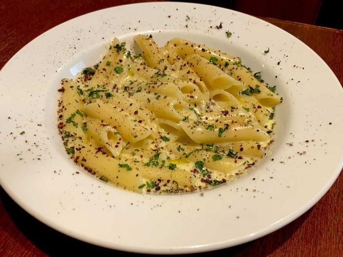 ペンネは別でゆでておきます。生クリームを弱火で半量になるくらいまで煮詰めて、最後にブルーチーズ・バター・ほんの少し麹を。お皿に盛り付けたら、コショウ、カカオニブを振って完成です。 本当にあっという間!ブルーチーズの香りがふわっと広がり、さらに口に運ぶとチーズのうまみやコクがしっかり。ペンネと濃厚なチーズソースが良く絡み、お互いの良さを引き立てています。 チーズとワインの相性は抜群!おうちでもぜひ、お好みのものを合わせてみてください。