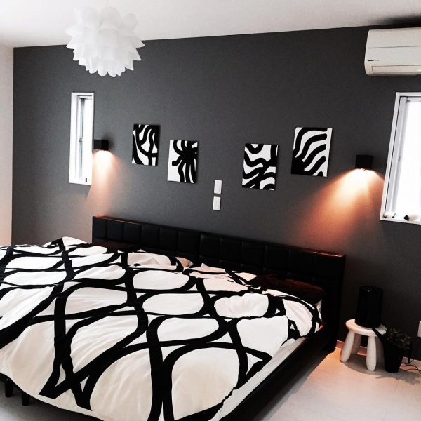 ブラック×ホワイトにこだわった海外のようなおしゃれでダイナミックな寝室では、4枚のファブリックパネルをアクセントにしています。