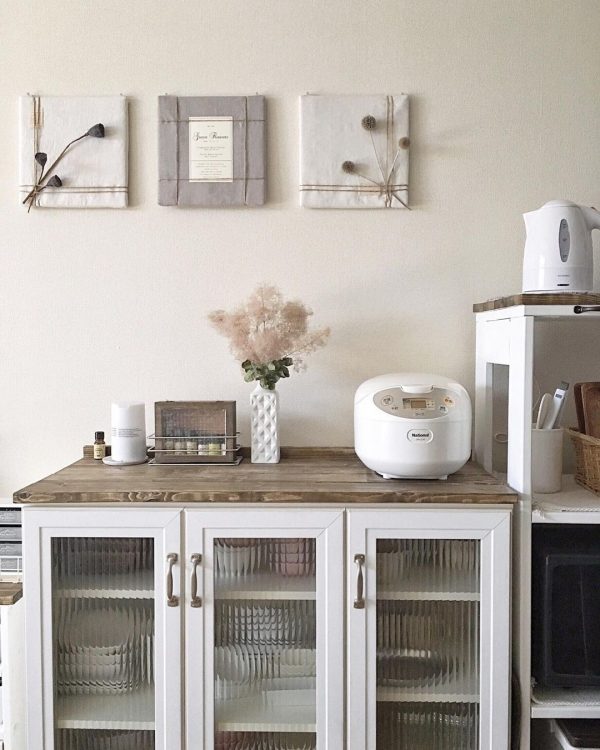 100均グッズを組み合わせて作成したお手製のファブリックパネルを、キッチン壁面に飾ったおしゃれな実例。