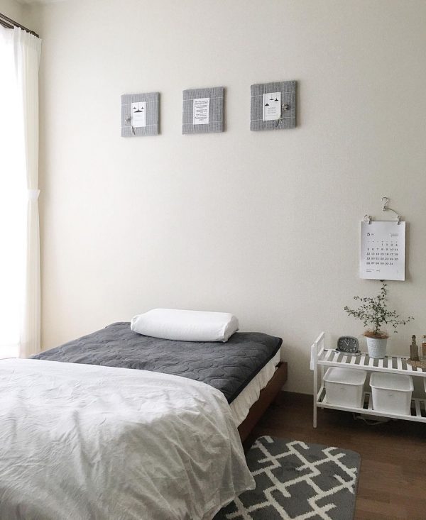 グレーとホワイトでシンプルにまとめた寝室では、小さめのファブリックパネル3枚並列にした飾り方。
