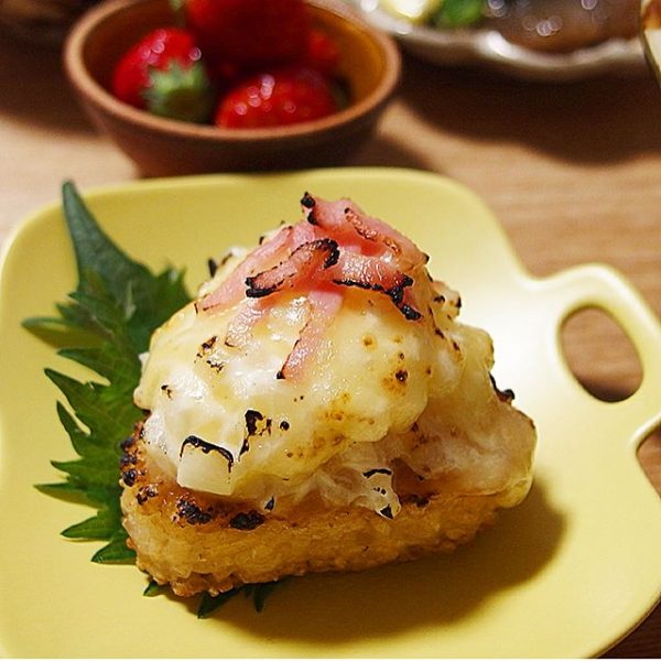 冷凍の焼きおにぎりに一手間加えた、簡単な変わり種レシピです。温めたおにぎりに玉ねぎのみじん切りとマヨネーズ、チーズ、ベーコンを乗せたら、バーナーで炙るだけ。