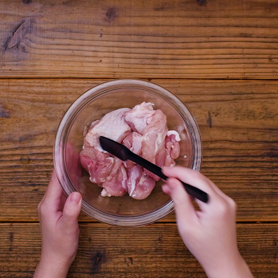 ・鶏肉は余分な脂を取り除き、ひと口大に切ります。