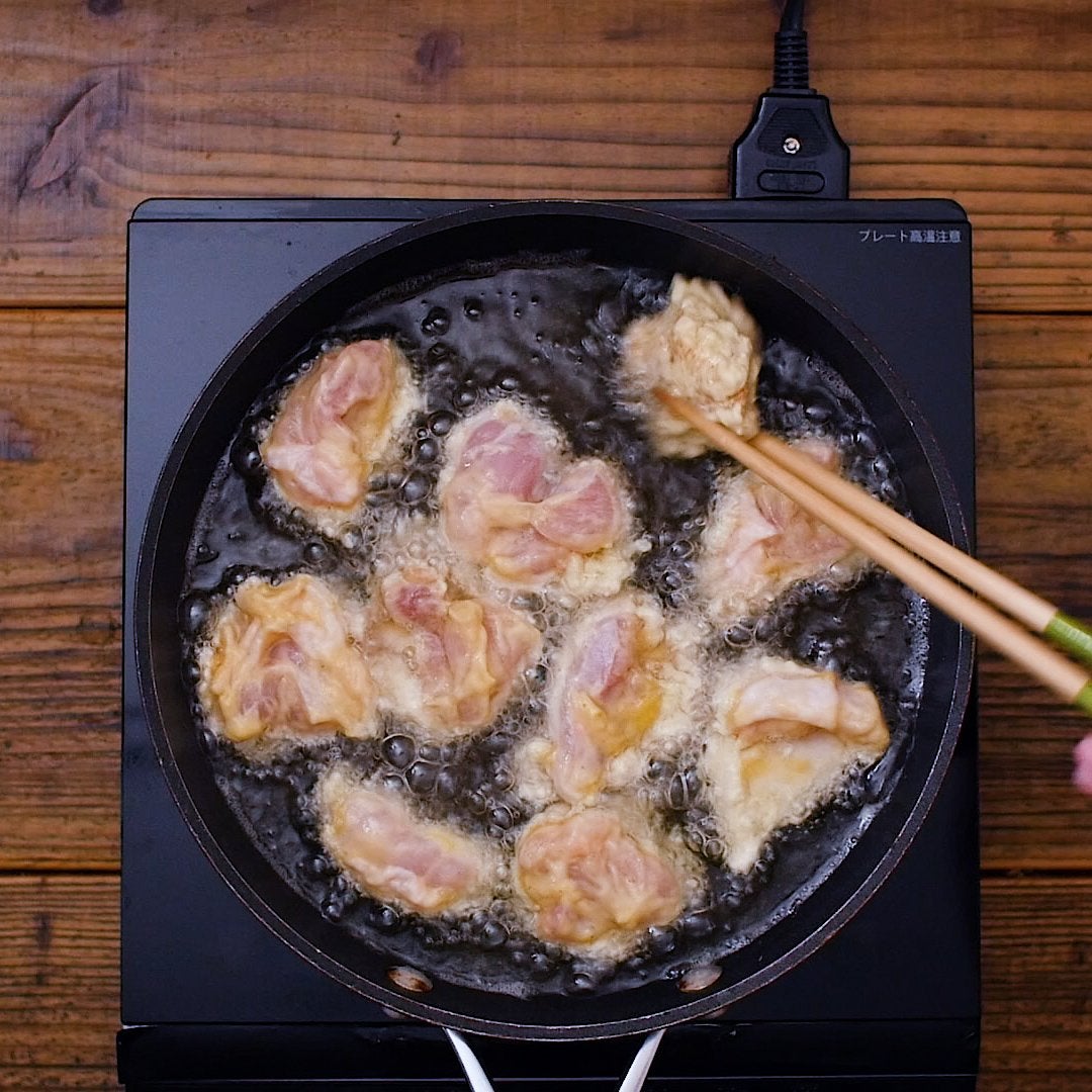 フライパンにサラダ油を深さ1.5cm入れて170℃に温めます。②を入れて火が通るまで揚げ焼きします。
