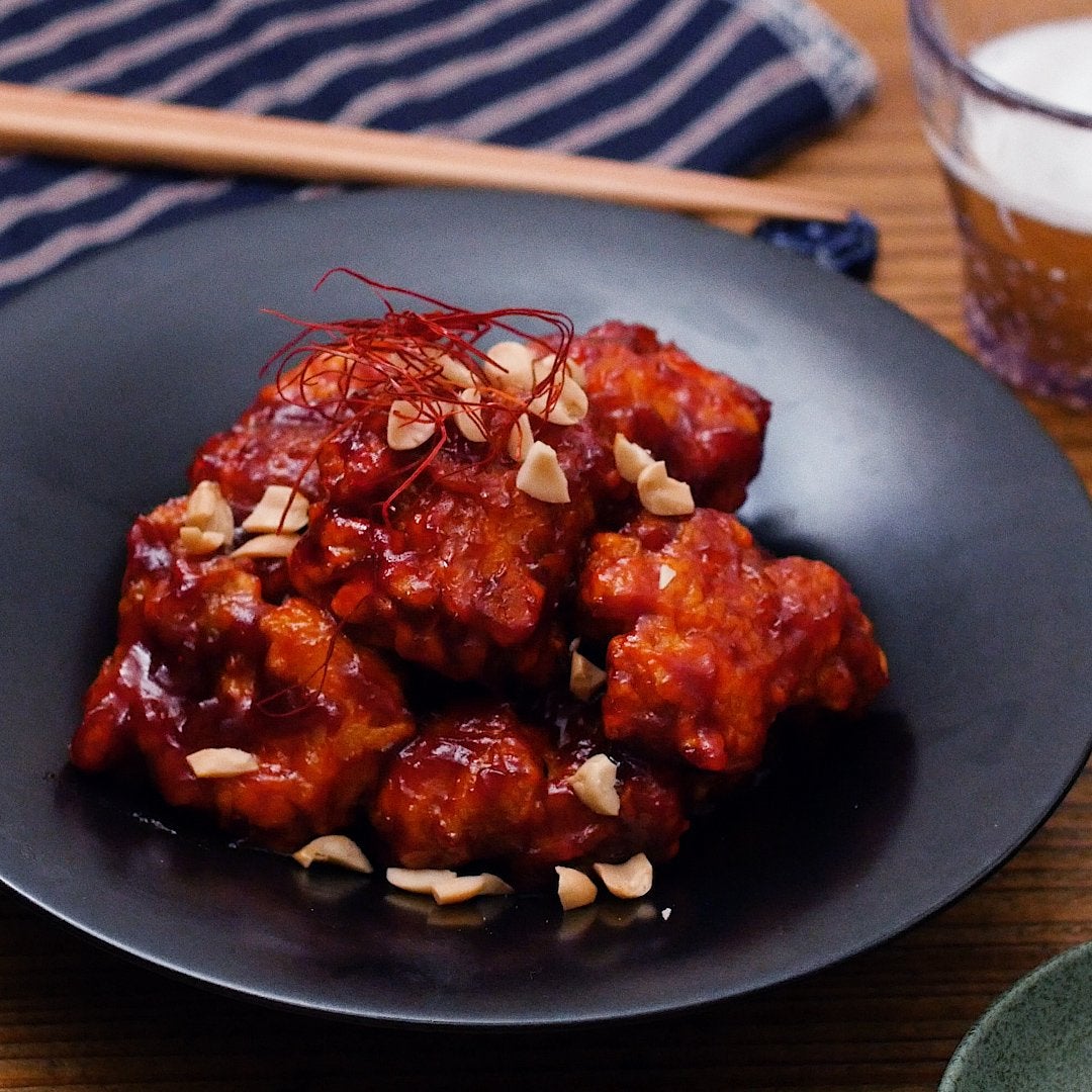 唐揚げを入れて絡めます。お好みでピーナッツ、糸唐辛子をトッピングして完成です。
