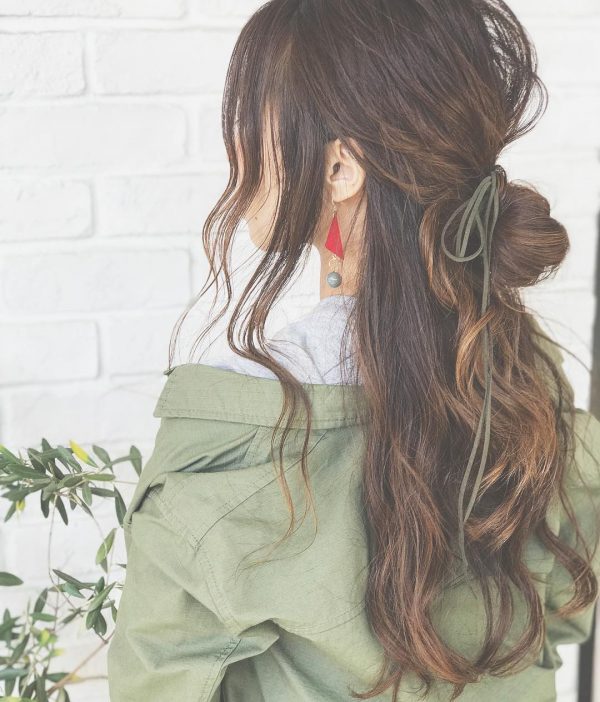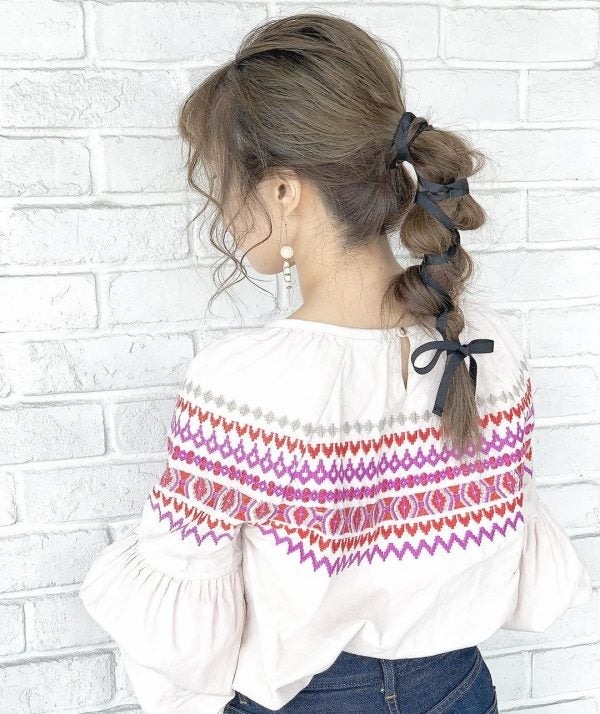 そのままだとカジュアルすぎる髪型ですが、リボンを巻き付けることで女性らしさと洒落感をプラス。