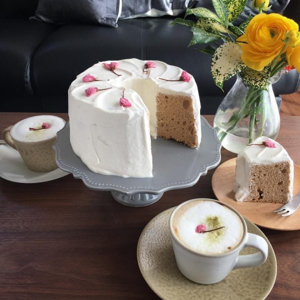 桜の葉パウダーを生地に入れて香りと風味付けをしたシフォンケーキは、ホイップクリームでたっぷりと雪のようにデコレーションすると素敵ですね。