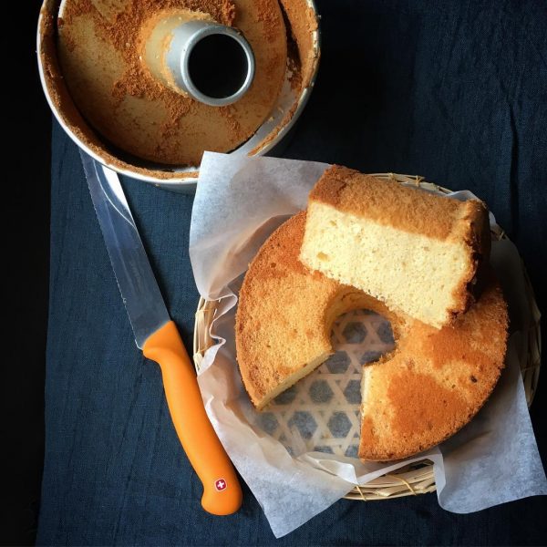 シフォンケーキの基本のレシピのポイントは、使う調理器具の水気をしっかり切っておくことと、メレンゲを硬く仕上げることですね。