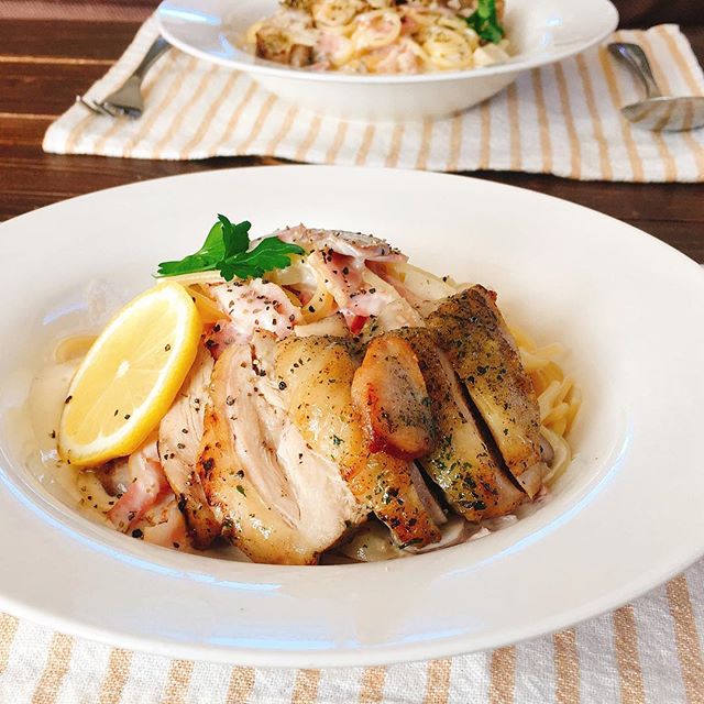 ハーブチキンのせレモンクリームパスタ
