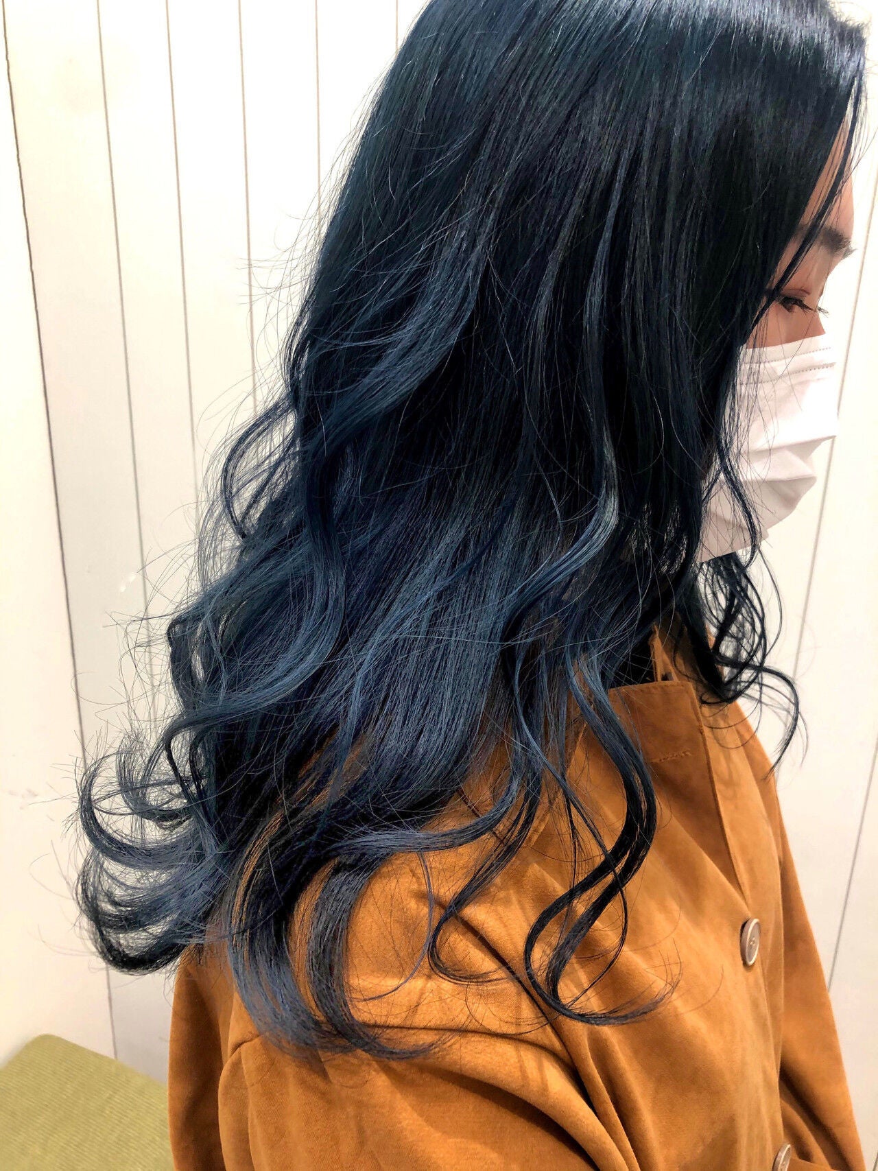 暗髪見えのブルーカラーは、室内では黒髪に、屋外ではキラキラ光る透明感抜群のカラーに変身できる魅力あるヘアスタイルです。色落ちが分かりにくいのも魅力です。