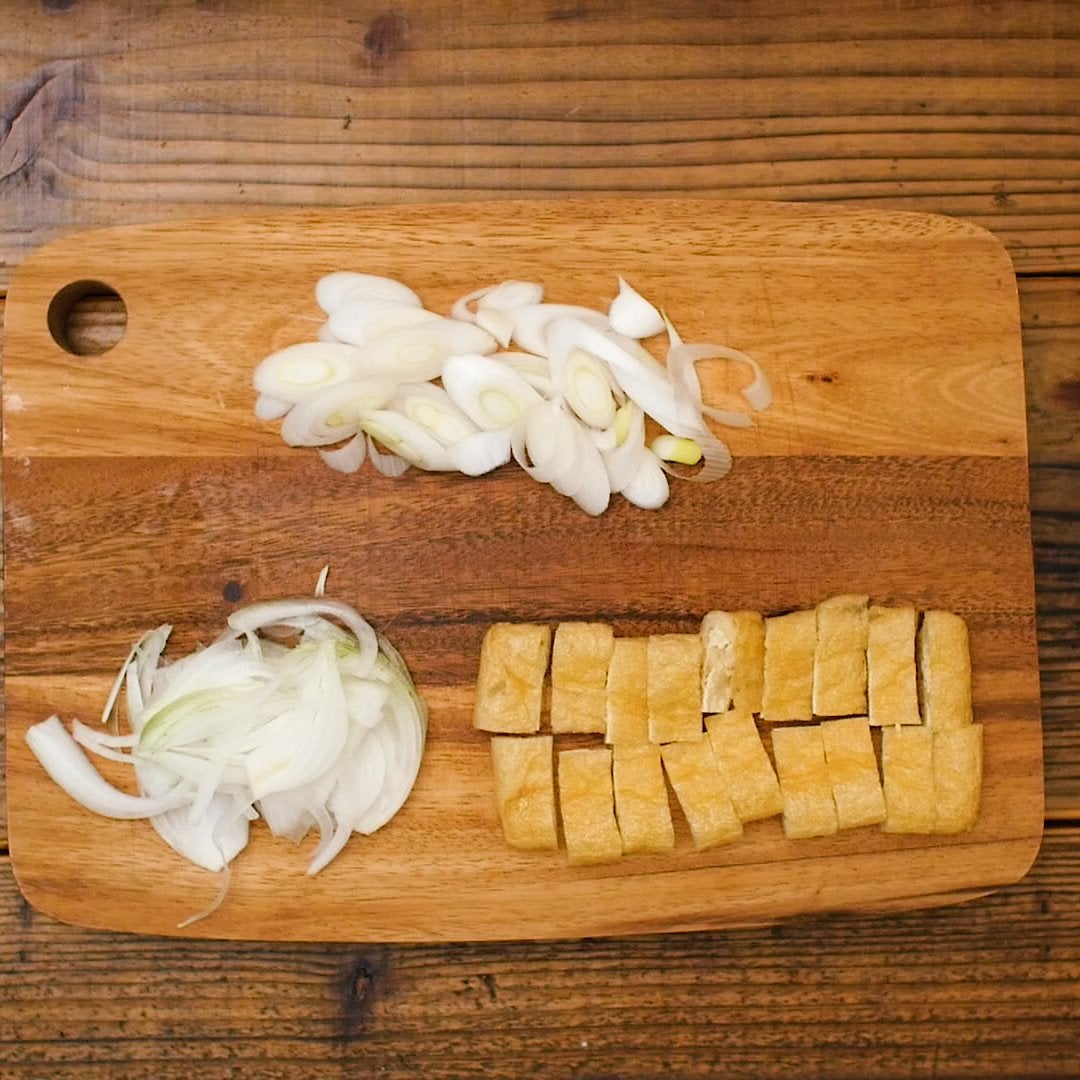 油揚げは横半分に切り、1cm幅に切ります。玉ねぎは薄切り、長ねぎは斜め薄切りにします。