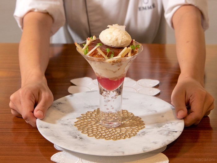 フレンチの名店「LATURE(ラチュレ)」や、三軒茶屋の人気パティスリー「patisserie Plaisir(パティスリー・プレジール)」などで腕を磨いたのち独立し、2019年に「エンメ」を開業しました。 パフェを始めたのは、アシェットデセールをより多くの人に知ってもらうために、キャッチーなパフェスタイルで提供したのがきっかけ。延命寺さんならではの感性と技をグラスに閉じ込めたパフェは、同店で一番人気のメニューとなりました。
