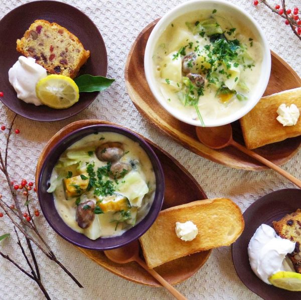 かぼちゃやじゃがいもはクリームスープに合う野菜で、あさりからもダシが出て美味しいスープになります。