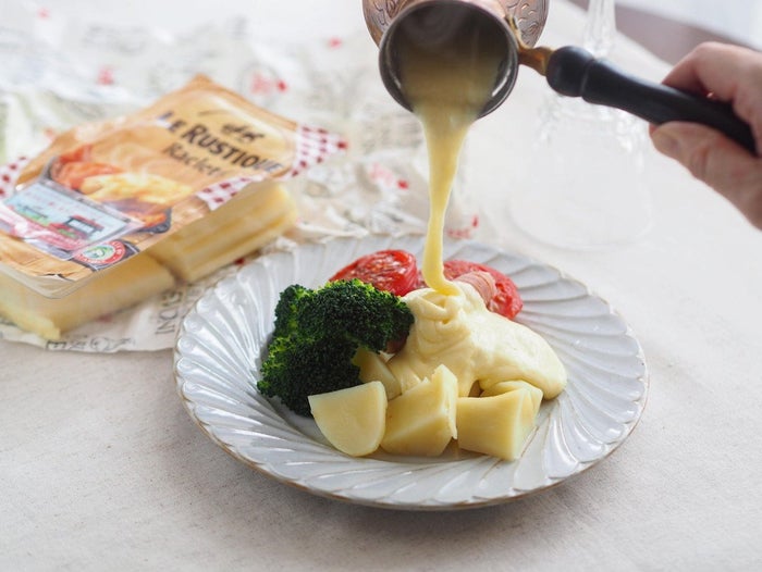 ラクレットチーズとは、スイス南西部原産のハードタイプチーズのこと。チーズの切り口を専用のヒーターを使って溶かし、やわらかくなったものをナイフで削いで温野菜やバゲットに豪快にかけるスイス料理「ラクレット」が有名です。とろりと溶けたチーズを目の前で豪快にかける様子がSNS映えすることもあり、ここ数年では日本でも取り扱う店が多くなっています。