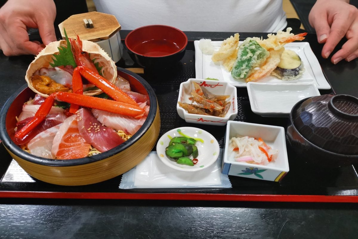 とろやサーモン、白身にたっぷりのカニやうになど、とんでもなく豪華な刺身がふんだんに入っており、東京ならこれだけで2,000円以上は取られそうなレベル。それに天ぷらや小鉢がついてくるのだから、お得感がハンパではない。