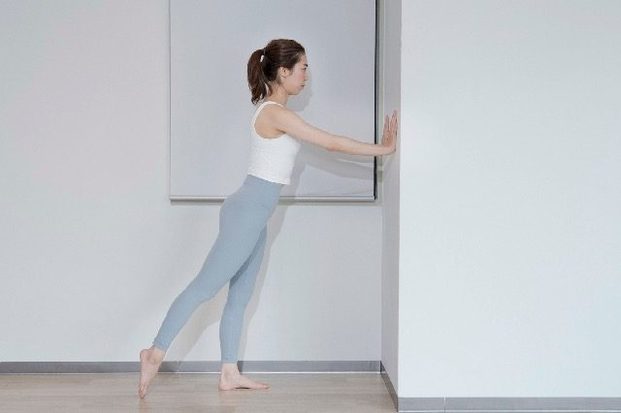 (1)壁に手をつき、脚を腰幅程度に開いて片脚を後ろに引く