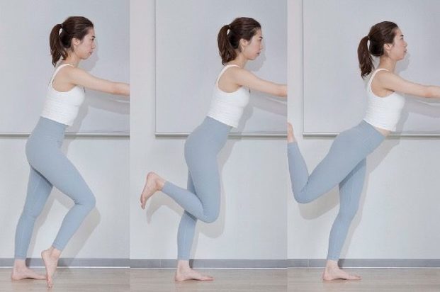 その後、かかとを(2)の位置に戻して20回繰り返し、その後反対の脚も同様に実践します。なお、実践中に前脚のひざが曲がってしまう(下写真左)、上げている脚のひざの位置が下がってしまう(下写真中)、腰が反ってしまう(下写真右)といった状態だと期待する効果を得られないので注意しましょう。