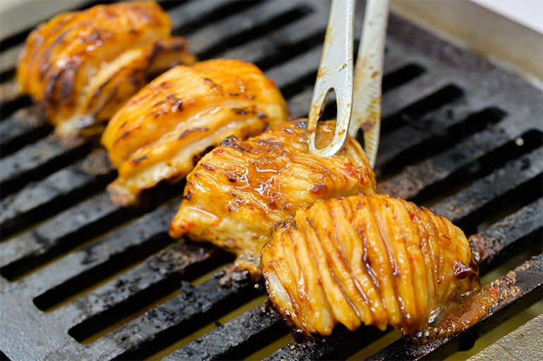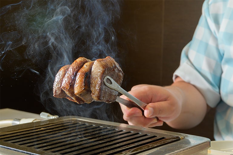トングで4枚のタンを挟みながら、逆サイドも焼くために、そのままつかんでエイッとひっくり返す。これぞ、長年かけて生みだした、幸せを求めて牛タンをターンさせる「ハッピーターン」という究極奥義!